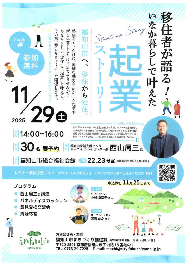 日 時: 2025年11月29日(土)14:00〜16:00会 場: 福知山市総合福祉会館 2階 22・23号室 参加費: 無料(要予約・先着30名)講 師: 西山周三 氏(福知山産業支援センター センター長)内 容: 基調講演/パネルディスカッション/意見交換・質疑応答
